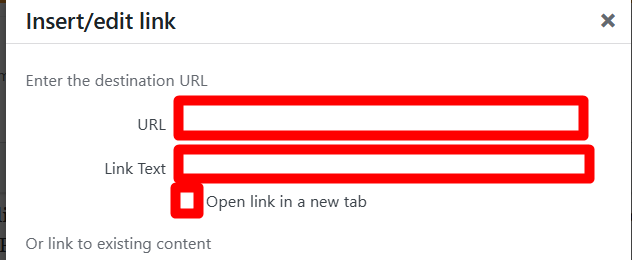 - Enter the link that you want to insert (copy paste this from your browser showing the relevant link), enter the text that you want people to see and click on. It's best to tick the box to open the link in a new tab so that they don't loose their place on your website.