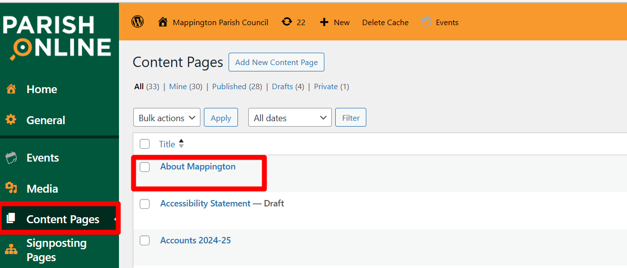 - In the dashboard, go to content pages and select the page that you wish to edit.