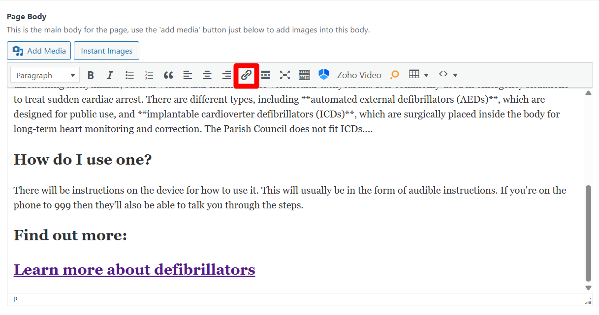 You may wish to add external links to your content pages, for example, you may wish to have a planning applications page that links to your district or unitary authority.