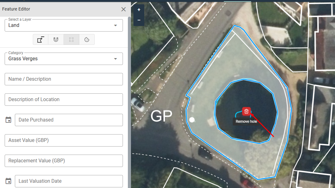 If you want to remove a hole from a feature, go back into Editing mode (steps 1 and 2 previously), hover over the area you want to remove and click the Bin icon. Then save.