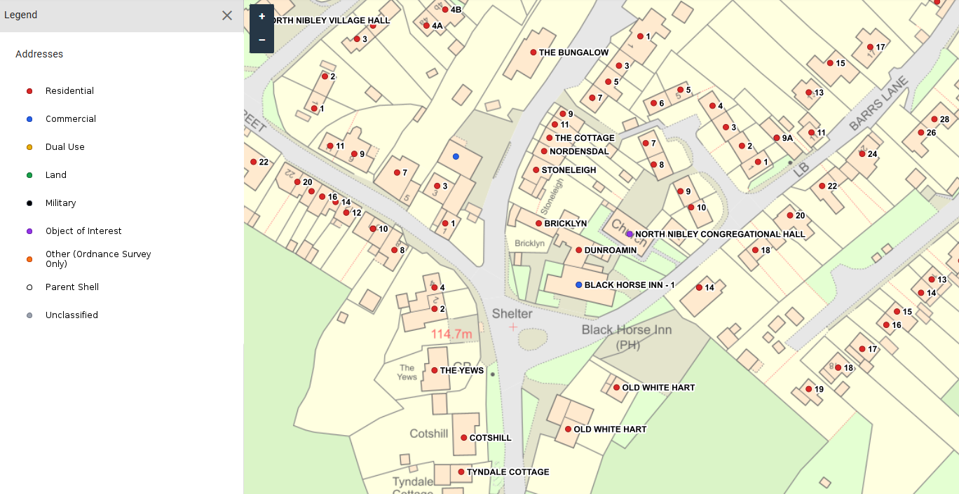 - Switch on the Addresses layer in the Addresses collection to display the map of points sitting over every addressable property. (this may be in a slightly different position in the list to he screenshot below)