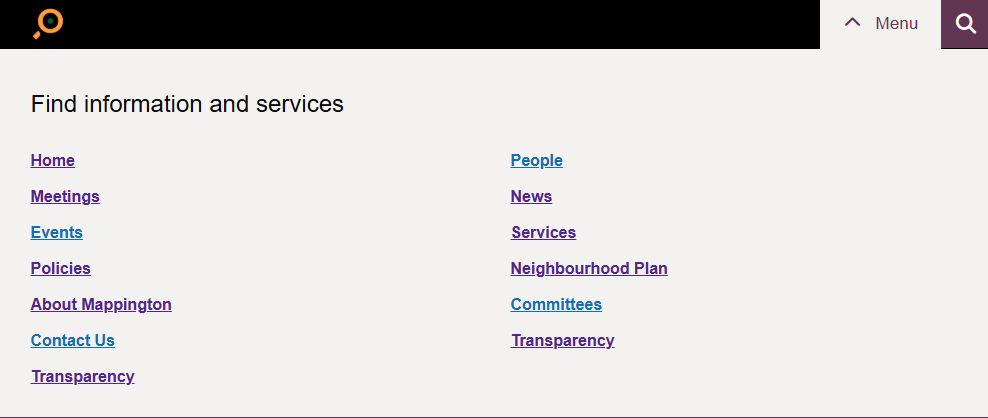 The website has a number of built in Menu items which are built in Signposting Pages and cannot be changed; these are People, Meetings, News Articles (can be switched off by contacting us), Events (can be switched off by contacting us) and appear under their own heading on the Dashboard.