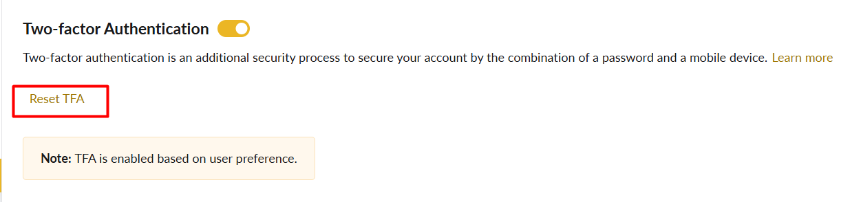 Overview We highly recommend using Two Factor Authentication. There may be circumstances where this is not feasible. In such cases, the Two-Factor Authentication can be switched off. Alternatively, a user may need to have their Two-Factor ...