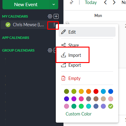 - Under My Calendars there's your own calendar. Click the three dots icon that appears when you hover over it.