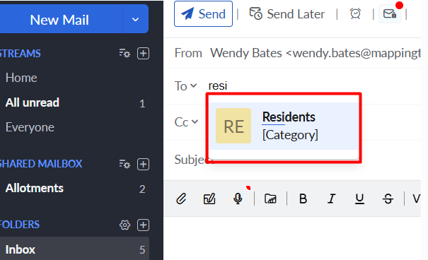 Go to your mailbox. Click on "New Mail" and in the "To" field, start typing the category of contacts that you wish to send your email to; a box with that category of contacts will pop up. Just click on this box to select those contacts. Remember, if you don't want others to be able to see the email addresses, you'll need to enter this in the BCC field!